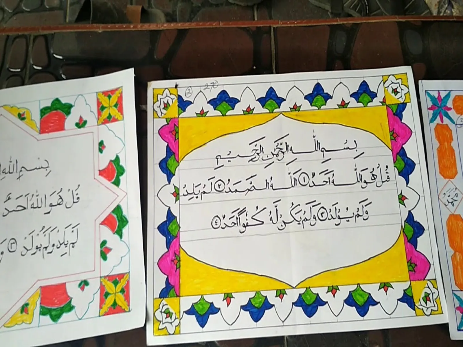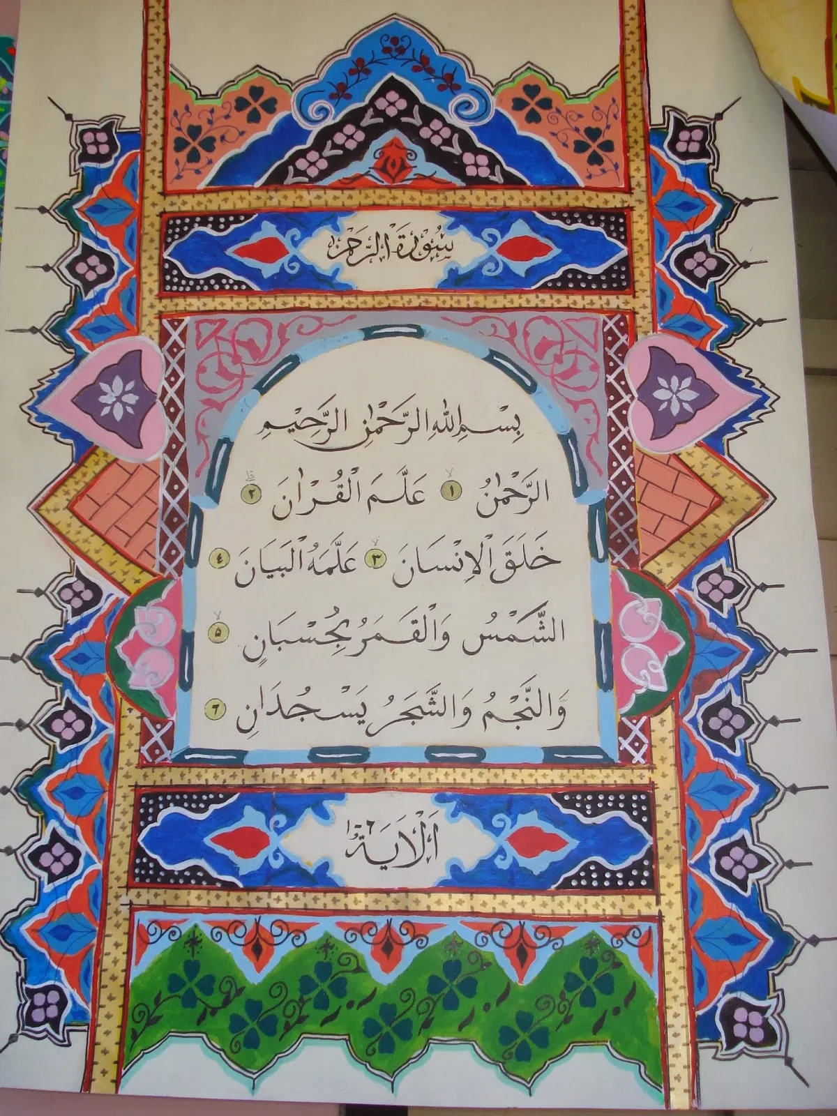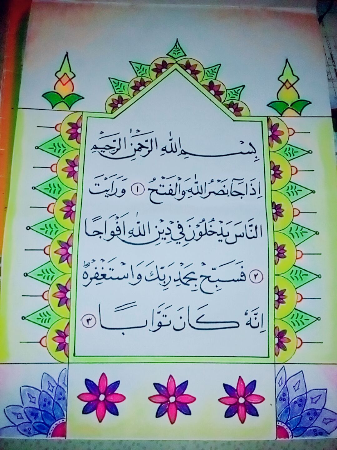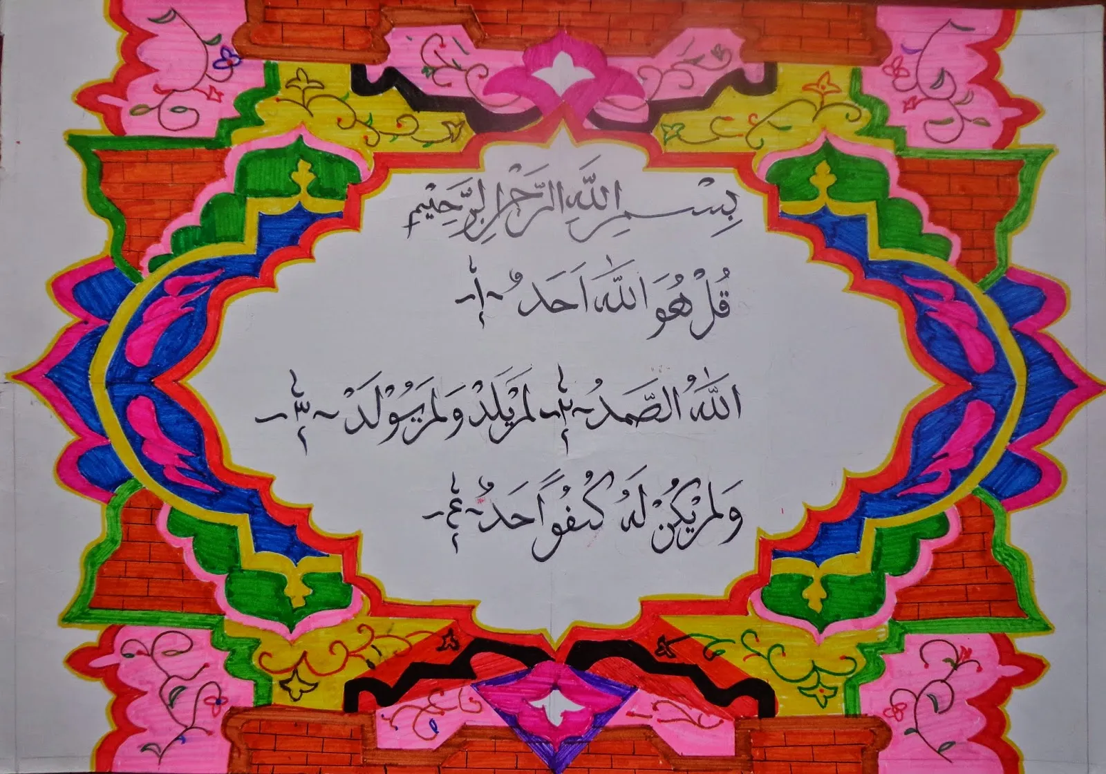 Motif kubah mesjid dengan sedikit sentuhan motif batik dihadirkan dengan warna-warna yg mencolok seperti warna merah, biru tu,unggu,pink,hijau, dan jingga. Adapun proses pembuatan gambar bingkai kaligrafi seperti diatas pastinya terasa cukup sulit, karena meski simpel gambar bingkai kaligrafi diatas namun desain dan motif yg dihadirkan begitu banyak pada setiap bagian. Dan kalian dapat menggunakan warna -warana santai dan lembut untuk hasil yg terkesan simpel dan indah tanpa hadirnya kesan mencolok padanya.