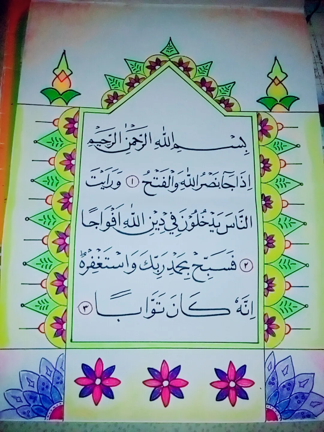 Bentuk dan motif bingaki kaligrafi yg terdapat diatas sangat indah hadir dengan motif bunga ,dengan setengah lingkaran menutupinya, setengah lingkarang dengan ukuran yg kecil dengan garis lurus pendek di tengah , setelahnya ditambahkan dengan bentuk segitiga diantara kedua setengah lingkaran. Adapun ragam warna yg dihadirkan pada bingkai kaligrafi diatas ialah seperti, warn ungu, biru ,kuning dan hijau. Untuk dapat membuat motif dan desain bingkai kaligrafi seperti pada gambar diatas,maka kalian perlu menyediakan lurus dan bentukan lingkaran dalam proses pengerjaan nantinya.