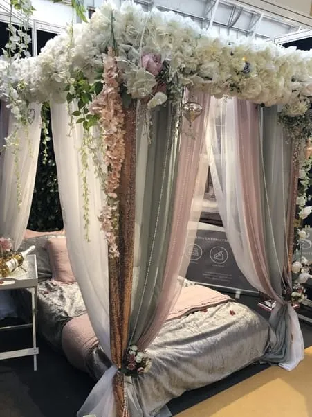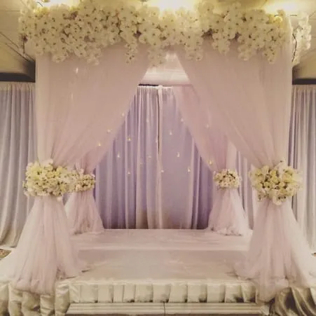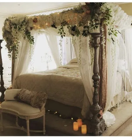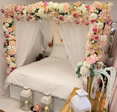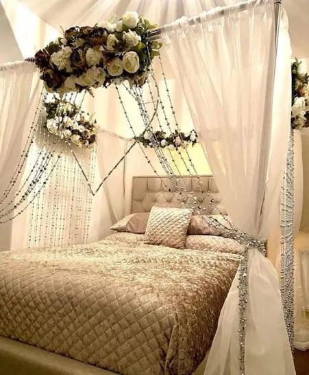Dekorasi kamar pengantin terakhir yaitu dengan memasang banyak elemen bunga disekeliling kelambu bewarna putih yg sangat indah dan elegan banget sob. Bunga memang cocok sekali jadi tema kamar pengantin karena memberikan simbol kehangatan dan kemesraan.