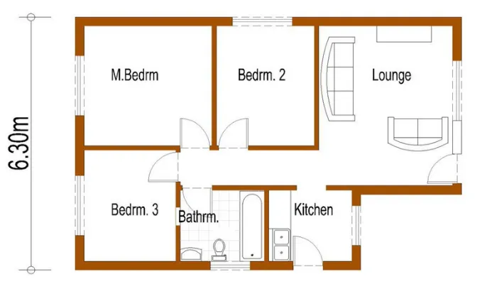 Berikut pada gambar pertama ini terdapat tampilan gambar denah rumah 6 x9 dengan ruangan yg terdiri dari 3 kamar tidur, 1 kamar mandi, dapur dan ruang tamu yg bersebelahan dengan ruangan dapur. Umumnya, lahan rumah seluas ini penggunaannya lebih diutamakan untuk ruangan utama seperti kamar tidur dan dapur.