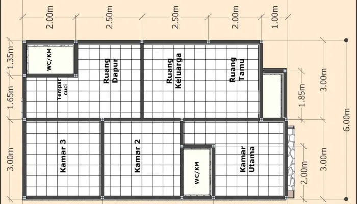 6. Denah Rumah 6×9 3 Kamar Tidur Tanpa Garasi Keenam