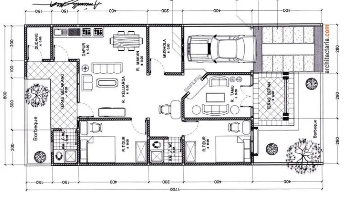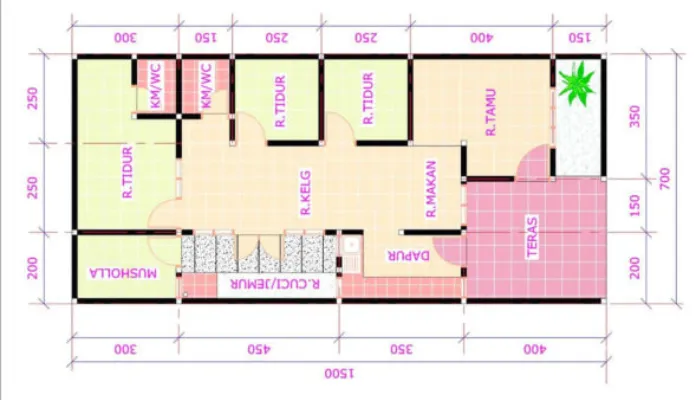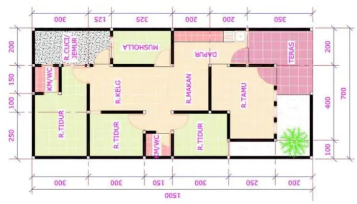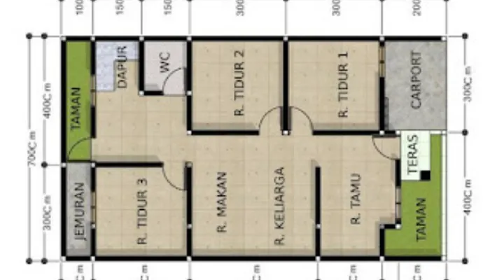 Ada kalanya, rumah berukuran minimalis jauh lebih diidamkan dibandingkan rumah berukuran luas. Nah, denah rumah ini salah satu contohnya. Seperti bisa lihat pada gambar diatas, rumah yg terdiri dari tiga kamar tidur ini memang terlihat serba pas-pasan. Terbukti dari lahan sisa yang dijadikan sebagai jalur lalu lintas tampak sempit seperti sebuah gang. Meskipun begitu, desain rumah ini dijamin tetap membuat kalian sekeluarga merasa nyaman, sob!