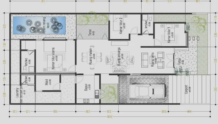 Rumah tanpa taman akan terasa begitu gersang. Oleh sebab itu, kalian perlu menambahkan area terbuka di depan atau belakang rumah. Contoh desain rumah 6×9 3 kamar tidur di atas punya car port untuk area parkir mobil. Sementara itu, di bagian depan sisi kiri terdapat teras dan taman. Untuk menambah sirkulasi udara dan cahaya alami, di bagian belakang rumah dapat ditambah dengan taman. Tak perlu terlalu besar, cukup 1 sampai 2 meter sahaja lebarnya.
