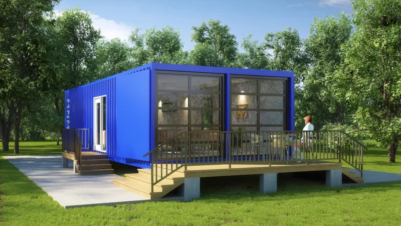 Pada gambar pertama ini dapat kalian lihat desain rumah rangka besi  bewarna biru tua berbntuk persegi yg dilengkapi dengan tangan disisi depan dan sisi samping rumah tersebut. Meski terkesan simpel, namun bila diperhatikan seksama tampilan rumah diatas sangatlah unik dan nampak modern ya sob. Adapun budgey yg diperlukan untuk membangun rumah tersebut tentulah  lumayan biayanya sob, lantaran material yg digunakan untuk membuatnya ialah rangka besi.