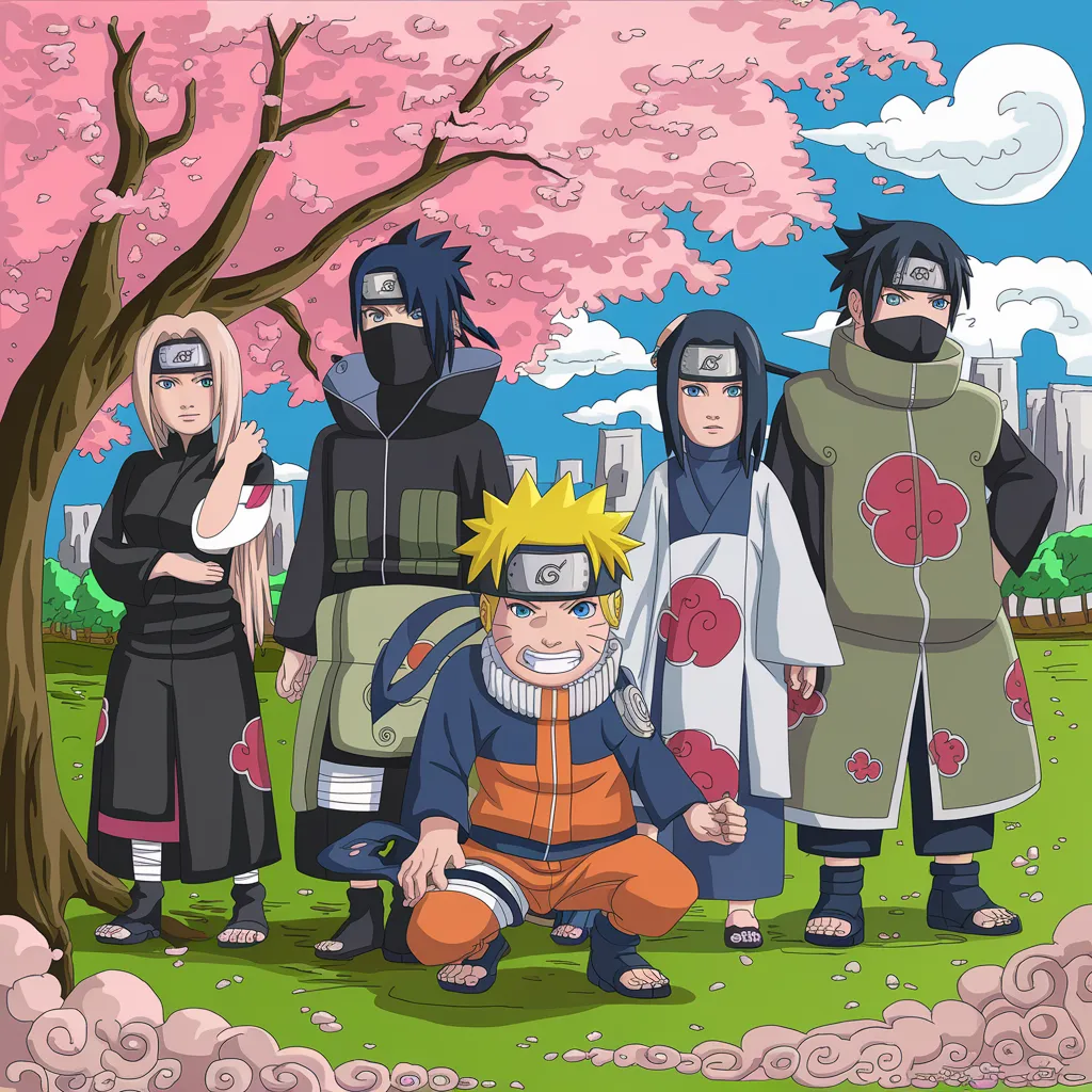 Ilustrasi karakter anime berdiri atau duduk di bawah pohon sakura yang mekar, menciptakan suasana romantis dan damai.