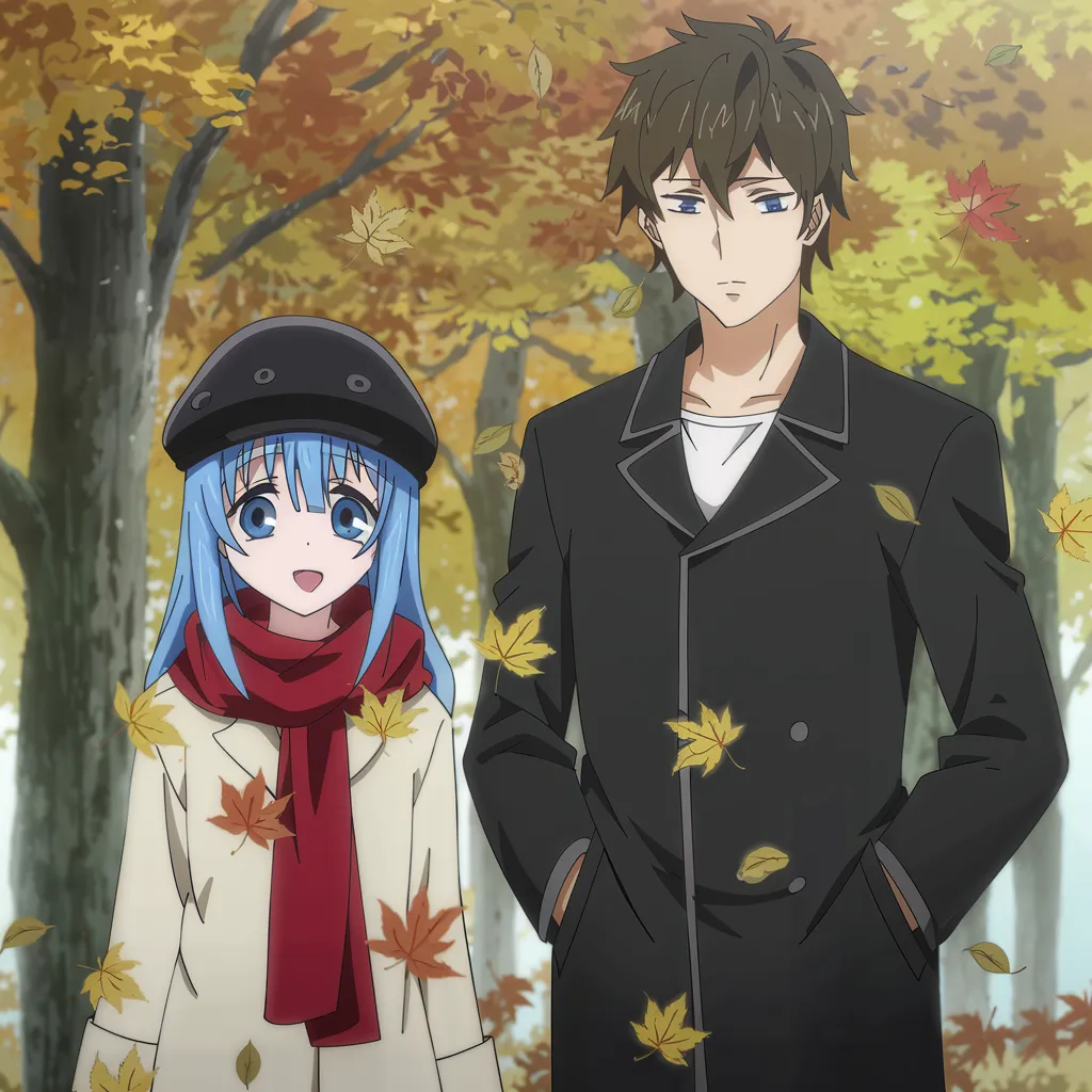 Gambar karakter anime berjalan di jalanan yang dipenuhi daun-daun gugur, memberikan nuansa hangat dan nostalgia.