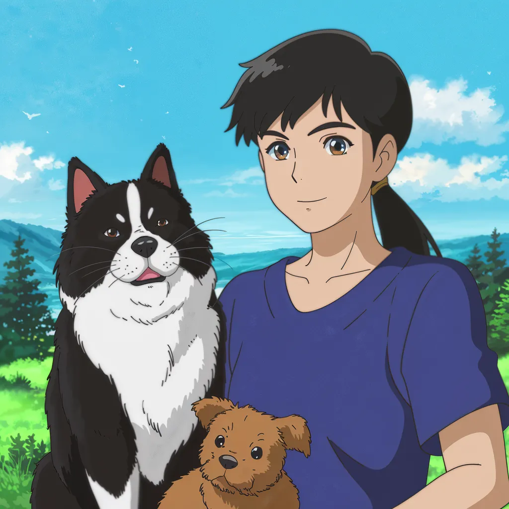 Ilustrasi karakter anime bermain atau berinteraksi dengan binatang peliharaan seperti kucing, anjing, atau burung, menunjukkan sisi lembut dan penuh kasih.