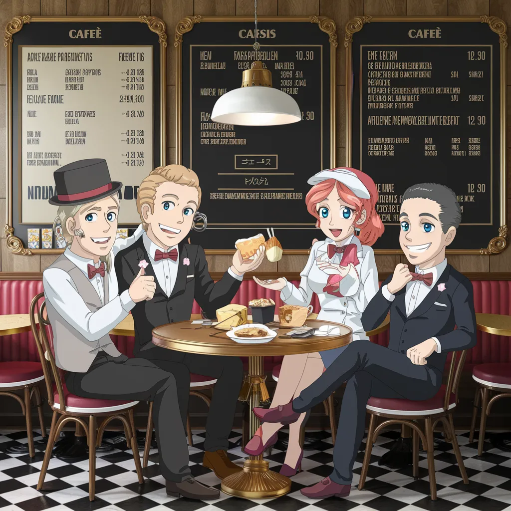 Ilustrasi karakter anime duduk di kafe klasik dengan dekorasi vintage, menikmati minuman favorit mereka.