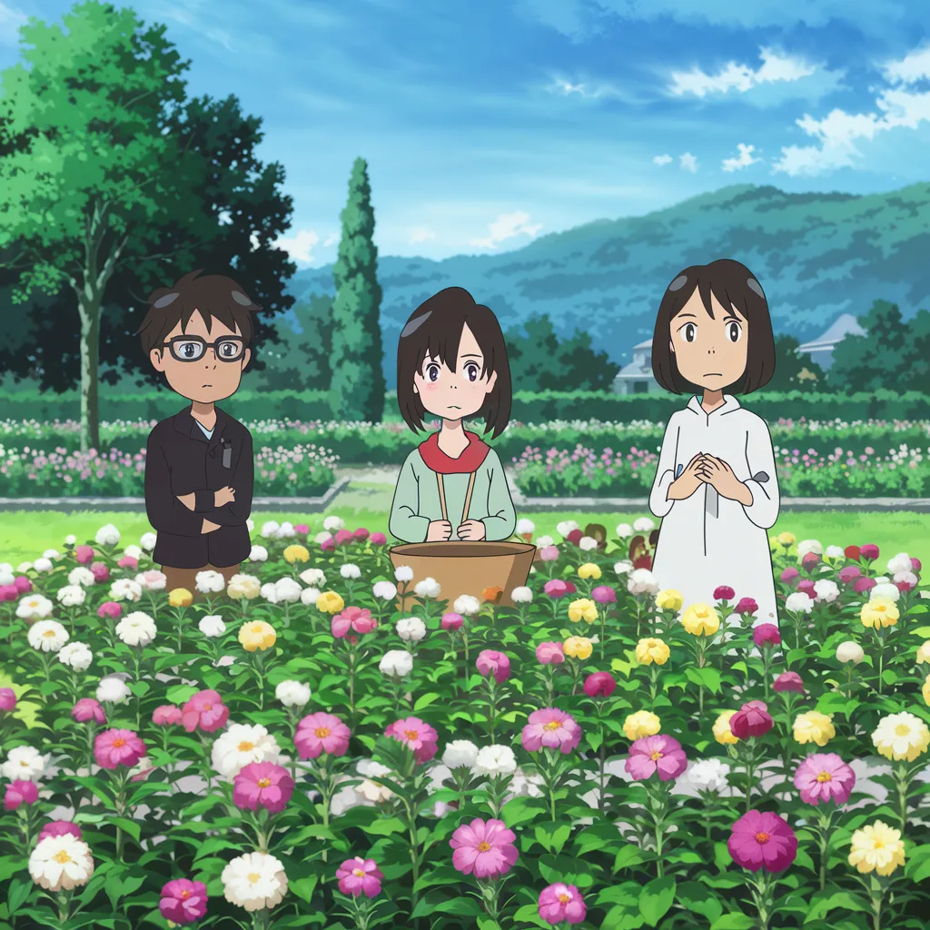 Gambar karakter anime berjalan di taman bunga yang dipenuhi berbagai jenis bunga, menampilkan keindahan alam.