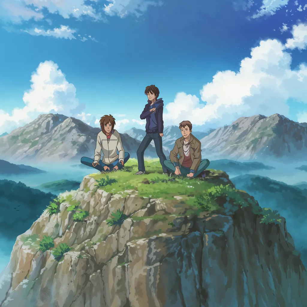 Ilustrasi karakter anime berdiri di puncak gunung dengan latar belakang langit biru dan awan putih, menciptakan kesan petualangan.