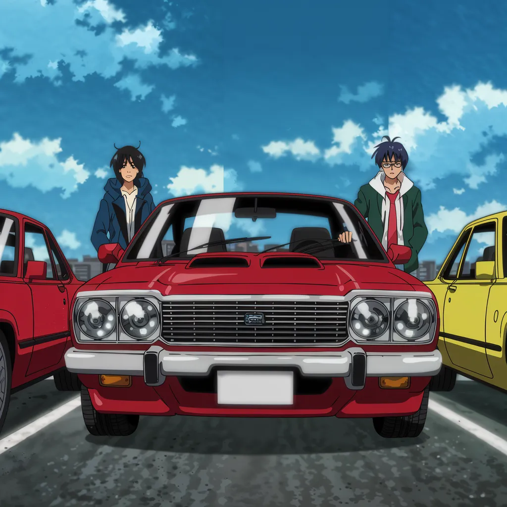 Ilustrasi karakter anime mengendarai mobil bergaya retro di jalanan kota, menambah sentuhan vintage dan keren.