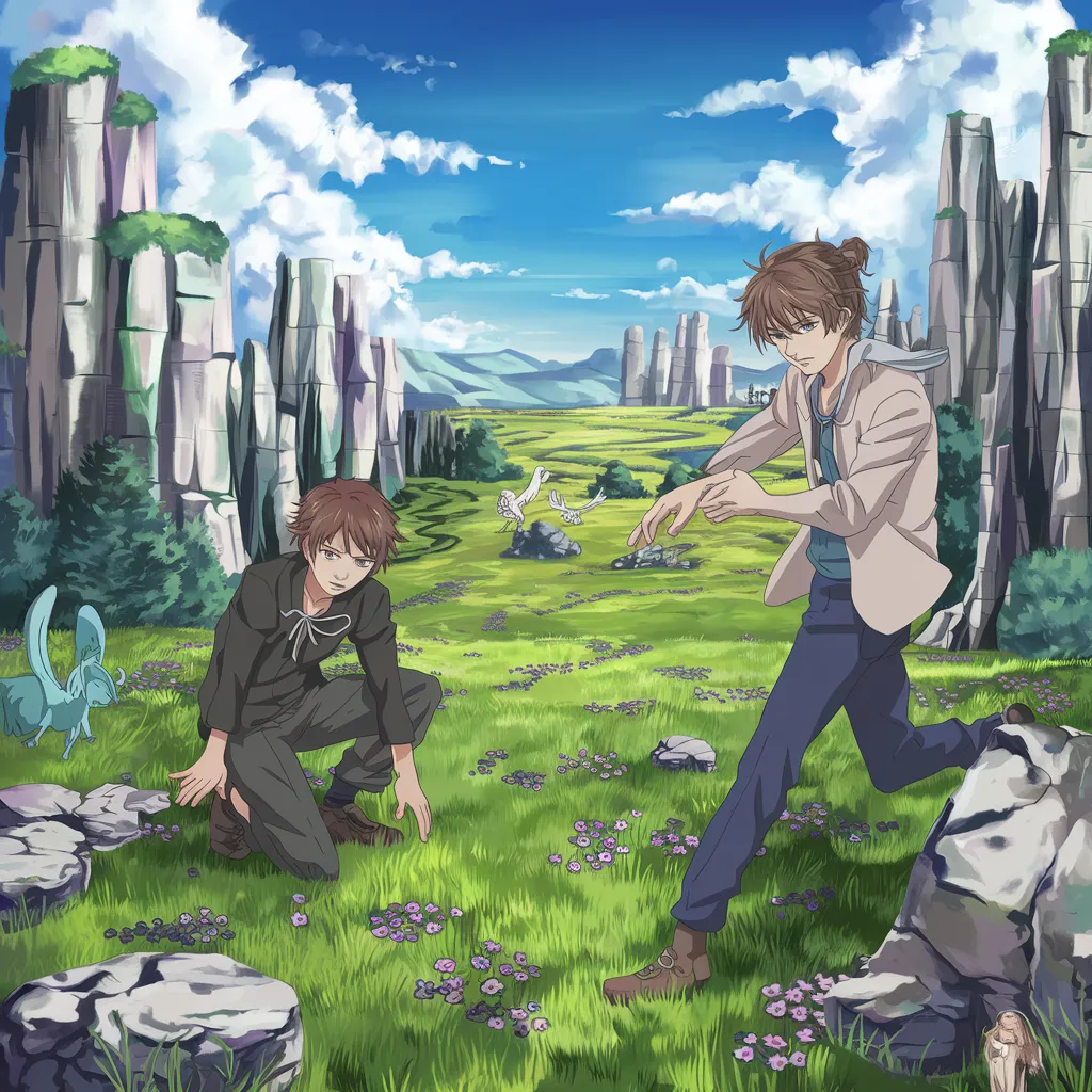 Ilustrasi karakter anime bermain di lembah hijau dengan sungai kecil yang mengalir, menampilkan keindahan alam yang tenang.