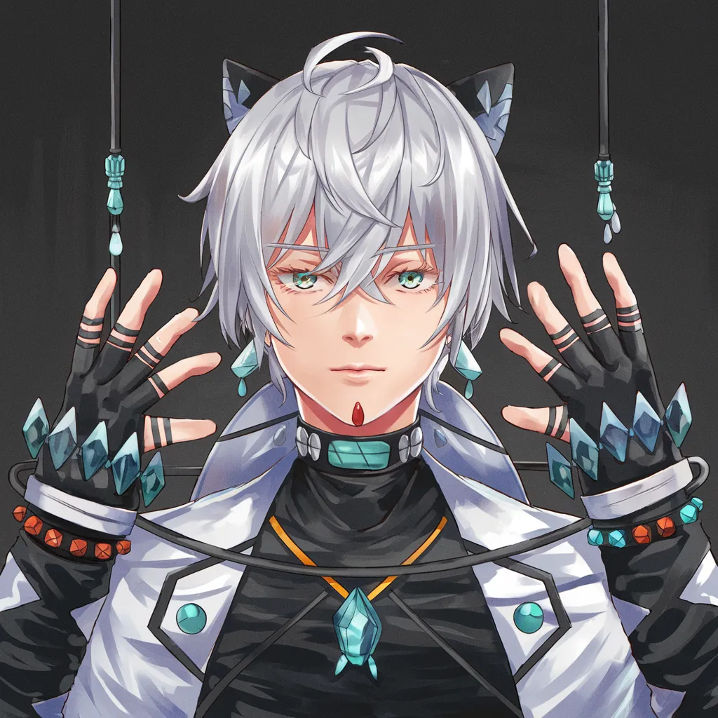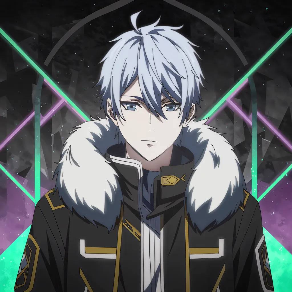 Ilustrasi karakter anime yang dikelilingi oleh bentuk geometris seperti segitiga, lingkaran, dan garis-garis tegas, memberikan tampilan modern dan unik.