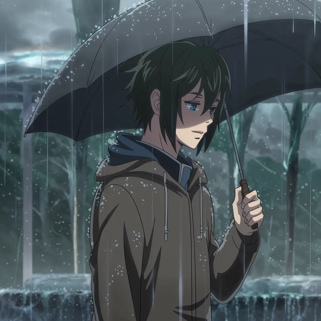 Ilustrasi karakter anime berjalan di bawah hujan gerimis dengan payung kecil, menciptakan suasana romantis dan melankolis.