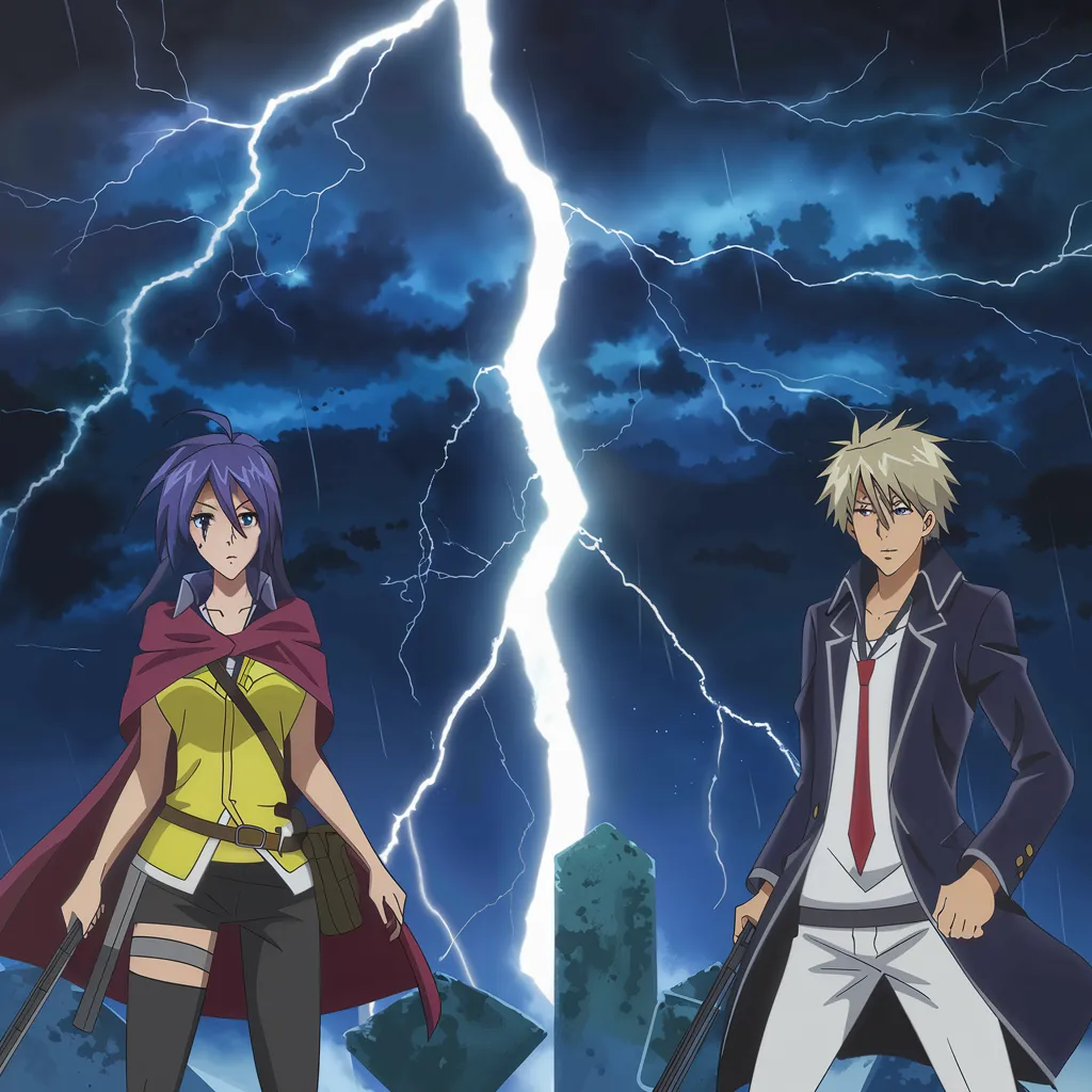 Gambar karakter anime menghadapi badai petir dengan cahaya kilat di latar belakang, menampilkan keberanian dan kekuatan.