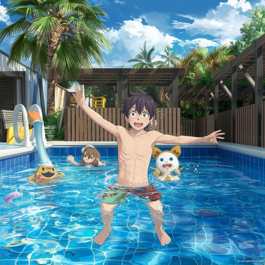 Ilustrasi karakter anime bermain air di kolam renang dengan air terjun kecil, memberikan kesan segar dan menyenangkan.