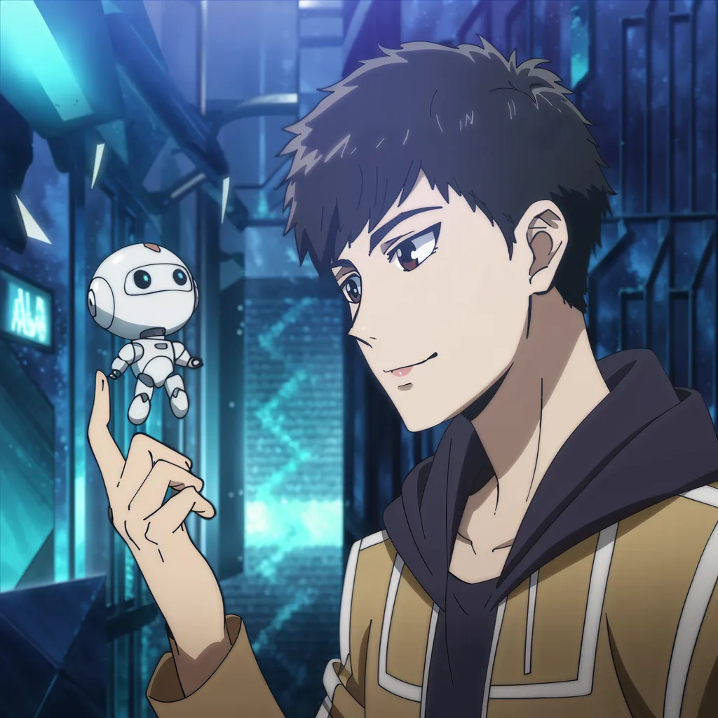 Ilustrasi karakter anime berinteraksi dengan robot kecil yang lucu, menambahkan elemen futuristik dan kreatif.