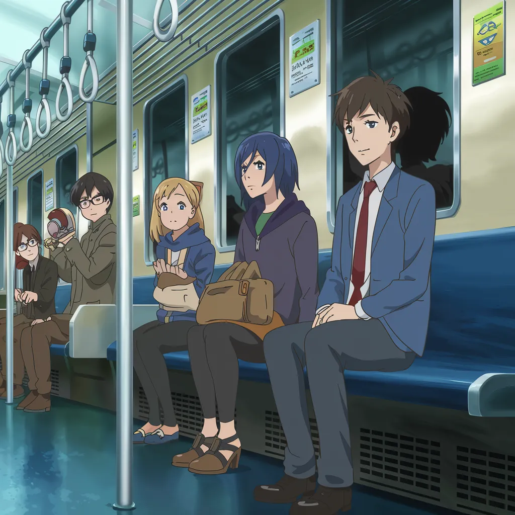 Gambar karakter anime menunggu kereta di stasiun dengan latar belakang kota yang sibuk, menciptakan suasana urban yang dinamis.