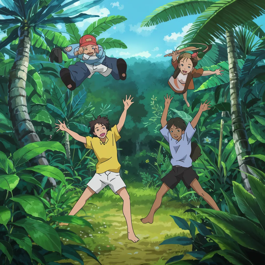 Gambar karakter anime menjelajahi hutan tropis dengan tanaman hijau yang lebat dan binatang-binatang eksotis, menciptakan suasana petualangan.