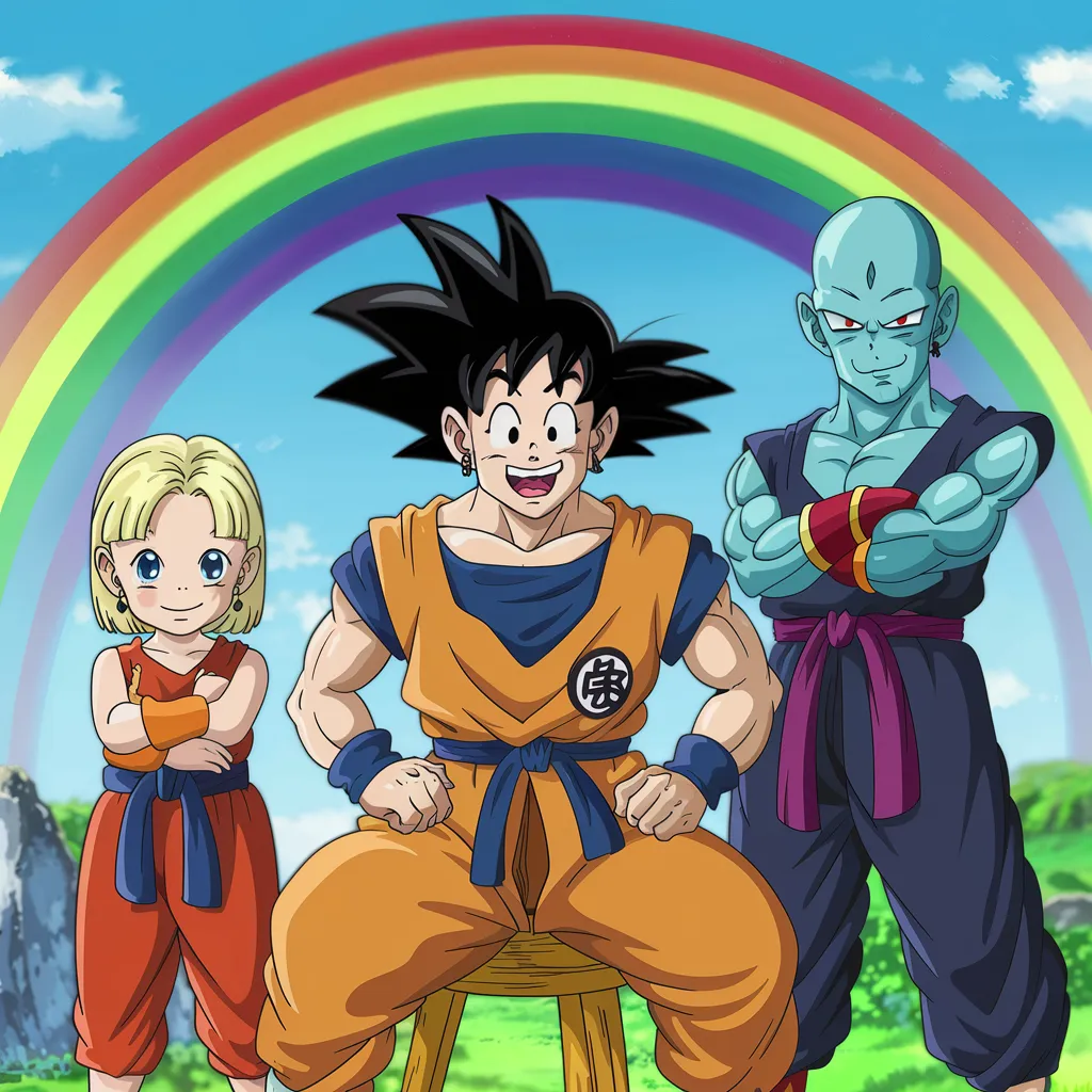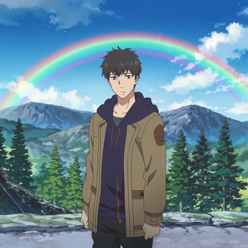 Gambar karakter anime berdiri di bawah pelangi besar dengan langit cerah, menampilkan momen kebahagiaan dan keindahan alam.