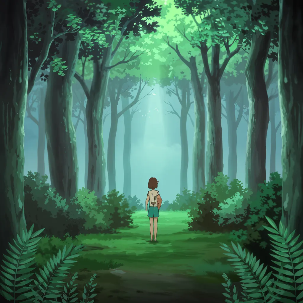 Ilustrasi karakter anime menjelajahi hutan yang dipenuhi kabut dan cahaya lembut, menciptakan suasana misterius dan mempesona.