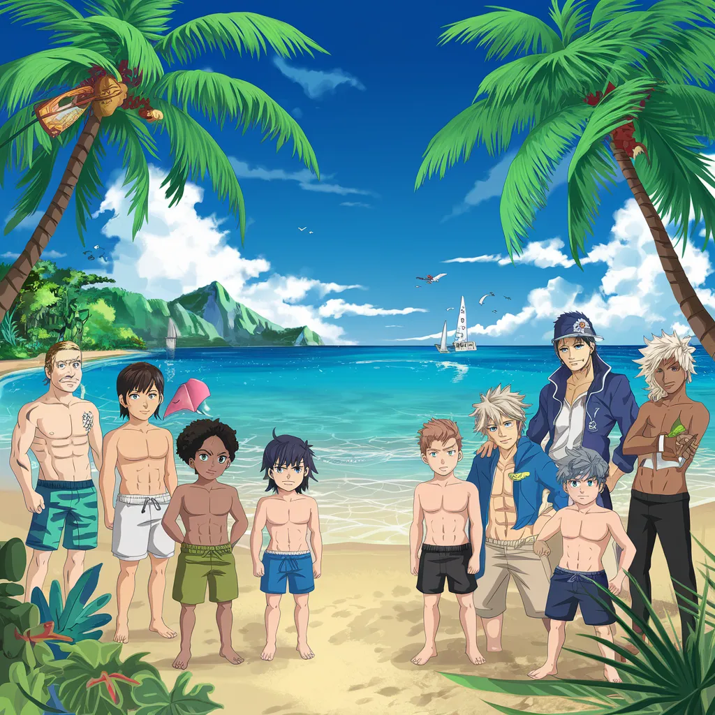 Gambar karakter anime bersantai di pantai tropis dengan pasir putih, laut biru, dan pohon kelapa, memberikan kesan liburan yang menyenangkan.
