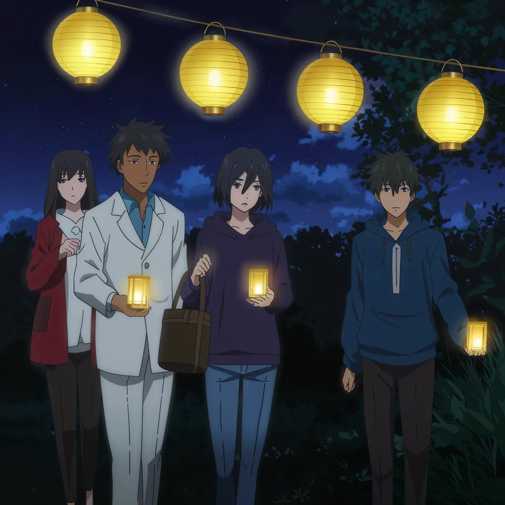 Ilustrasi karakter anime berjalan di antara lampion yang menyala di malam hari, menampilkan suasana meriah dan penuh warna.
