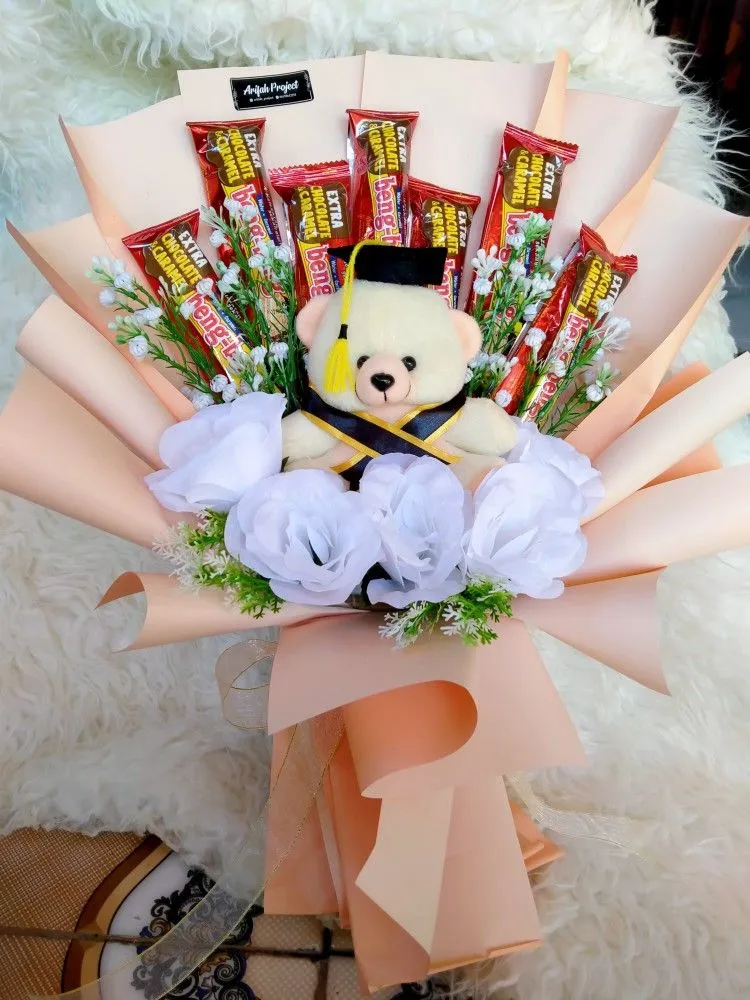 Tampilan bucket bunga yang dipadukan dengan uang yang diatur seperti bunga menciptakan makna ganda. Di satu sisi, bunga-bunga segar melambangkan keindahan, kehidupan, dan perhatian. Di sisi lain, uang yang dibentuk seperti bunga atau ditempatkan secara strategis dalam tampilan, menyiratkan nilai keuangan, kemakmuran, dan kemungkinan keberuntungan di masa depan. Ini adalah cara kreatif untuk menggabungkan elemen visual yang indah dengan makna yang lebih dalam.