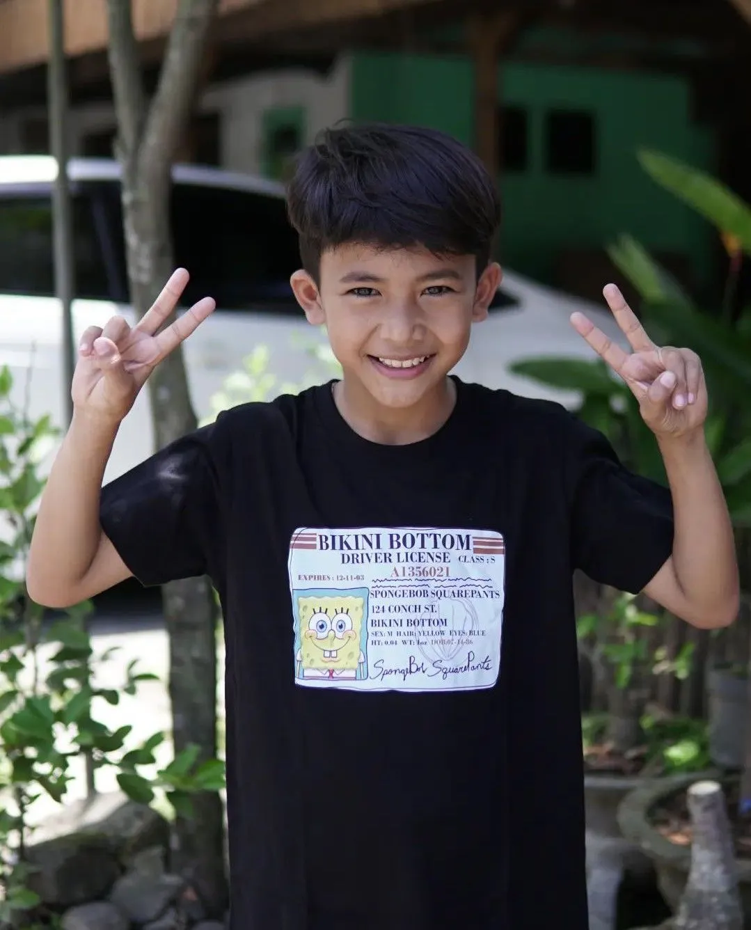 Seorang anak laki-laki sekolah dasar dengan wajah ganteng yang penuh pesona dan keceriaan. Senyumnya yang ramah serta mata yang cerdas dan berbinar-binar memberikan kesan ramah tamah kepada siapa pun yang bertemu dengannya. Hari itu, dia memilih untuk mengenakan kaos hitam yang simpel namun tetap stylish. Kaos tersebut memperlihatkan sisi maskulinnya dan memberikan kesan santai namun tetap rapi.
