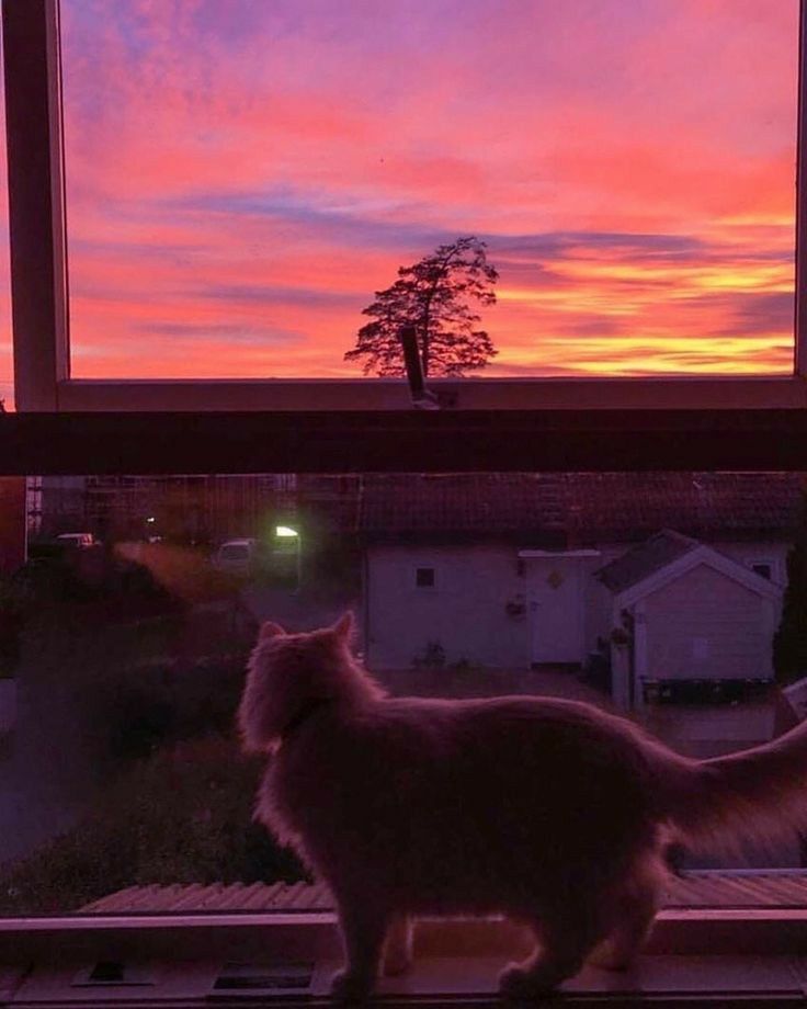 Warna-warna oranye, merah, dan merah muda yang terpancar di langit menciptakan latar belakang yang memikat dan mempesona. Kehadiran kucing yang duduk di dekat jendela menambahkan dimensi kemanjaan dan keintiman dalam gambar. Ekspresi rileks pada wajah kucing menciptakan perasaan keseimbangan dan kedamaian dalam momen ini.