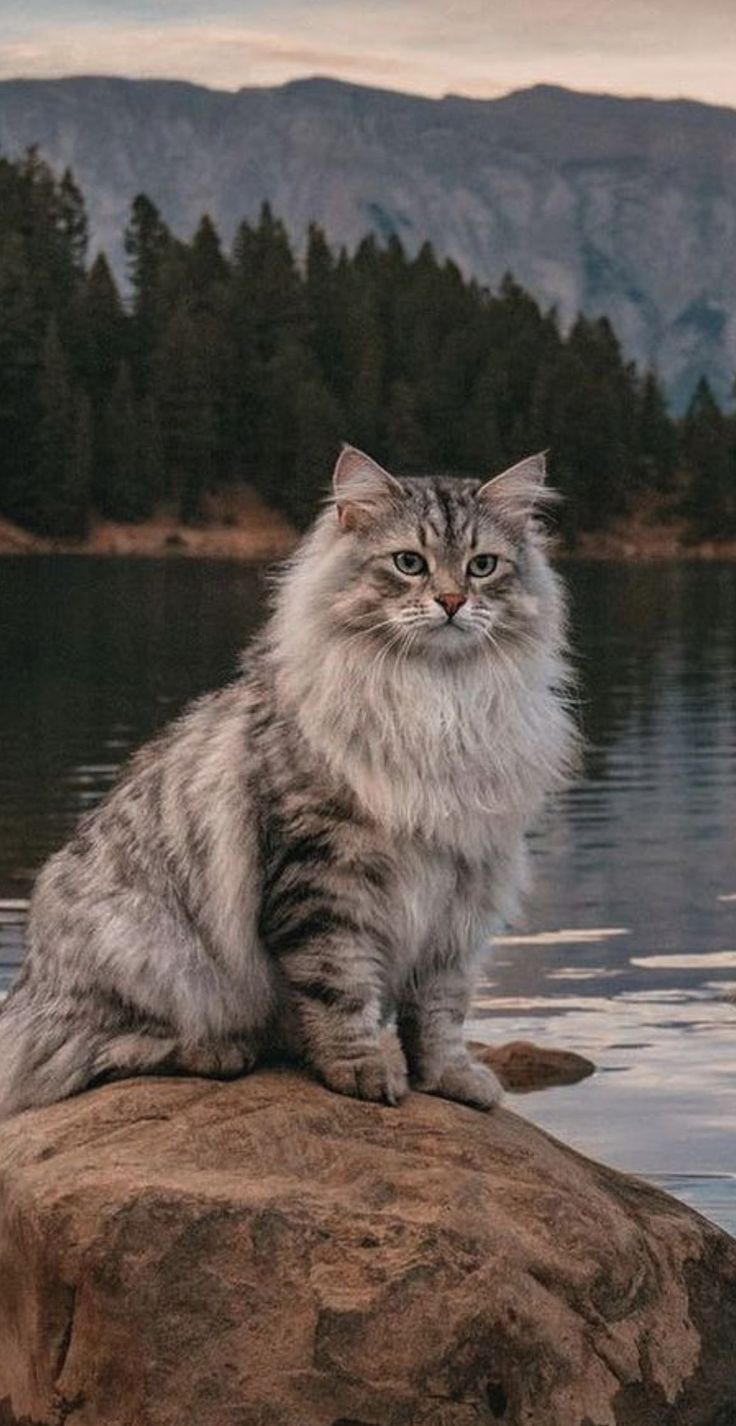 Pohon pinus yang terlihat di sebelah danau memberikan elemen alam yang indah dan memberi sentuhan estetika pada gambar. Kehadiran kucing yang duduk di atas bebatuan menambah pesona dan kehangatan pada gambar. Ekspresi santai pada wajah kucing menciptakan kesan bahwa ia benar-benar menikmati momen di alam terbuka ini.