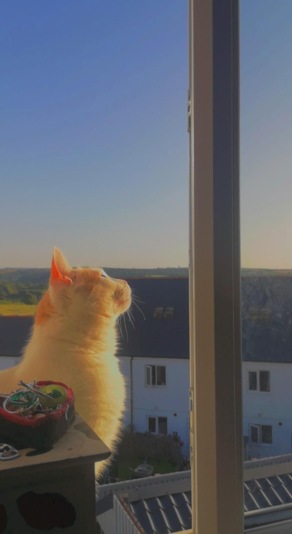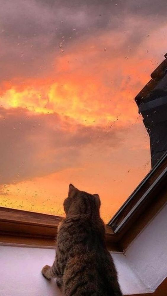 Gambar tersebut menggambarkan momen yang penuh dengan ketenangan dan keindahan alam. Di tengah gambar, ada seekor kucing yang duduk dengan anggun di dekat jendela. Kucing tersebut tampak sedang memandangi langit sore yang indah. Kehadiran kucing di dekat jendela menciptakan kesan kemanjaan dan kedekatan dengan alam. Suasana langit sore yang terlihat di latar belakang memberikan nuansa yang indah dan romantis.