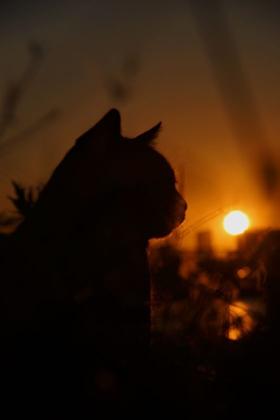 Cahaya redup dari matahari yang tenggelam memberikan sentuhan romantis dan misterius pada gambar. Kucing yang terlihat gelap di tengah cahaya redup menciptakan perasaan rasa ingin tahu dan kehadiran yang kuat. Ekspresi kucing yang mungkin tengah waspada atau merenung memberikan kesan bahwa ia sedang menikmati momen senja yang spesial.