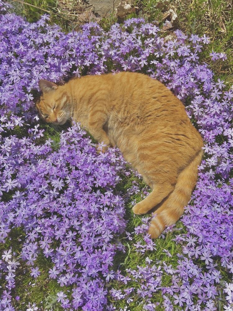 Gambar tersebut menggambarkan momen ketenangan dan keindahan alam yang mempesona. Di tengah gambar, ada seekor kucing oranye yang rebahan dengan santainya di antara rerumputan dan bunga Emerald Biru yang indah. Kucing tersebut terlihat tertidur pulas, menciptakan kesan kenyamanan dan kebahagiaan dalam tidurnya. Latar belakang rerumputan hijau dan bunga Emerald Biru menciptakan nuansa alami yang segar.