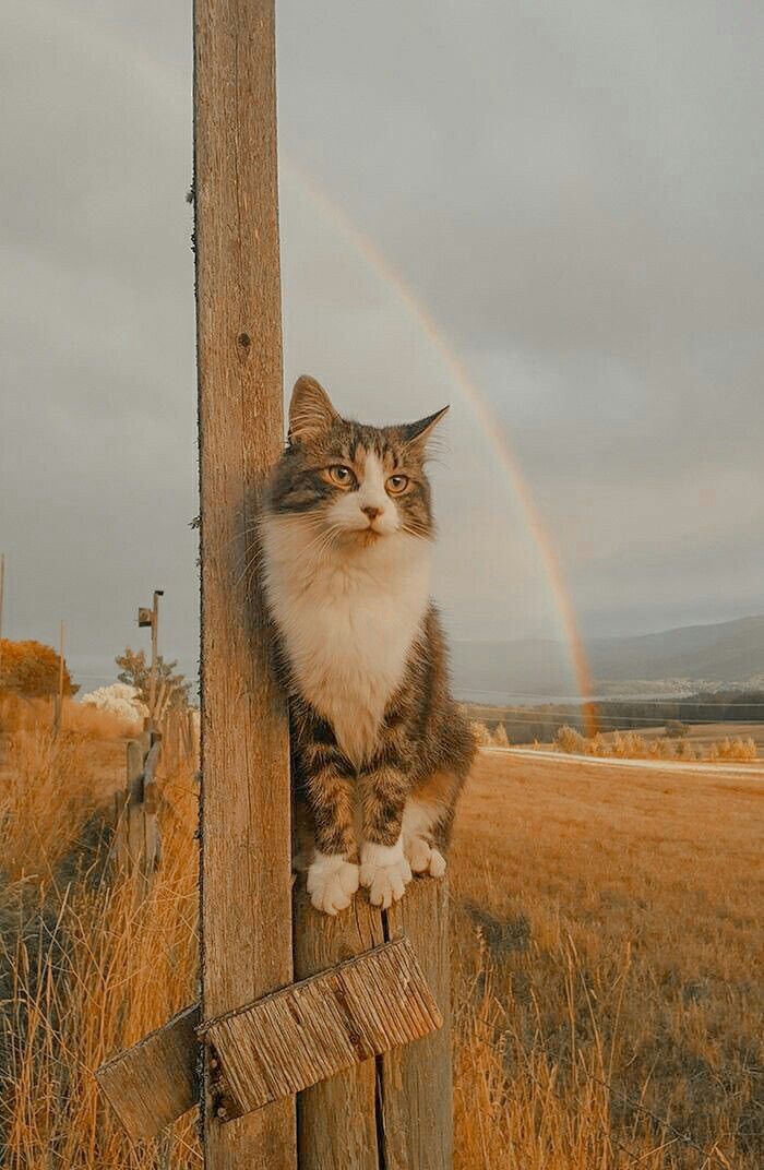 Kucing yang duduk di atas batang kayu memberikan perasaan kehangatan dan kemanjaan. Ekspresi kucing yang tenang dan anggun memberikan sentuhan keseimbangan dan kedamaian pada gambar. Kombinasi antara kehadiran kucing, latar belakang langit mendung, dan pelangi yang hendak muncul menciptakan tampilan yang memadukan misteri dan keindahan.