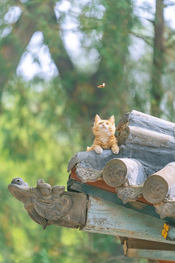 Gambar tersebut membawa kesan ketenangan dan kedamaian dalam momen sederhana. Di tengah gambar, terdapat seekor kucing oranye yang sedang duduk santai di atas genteng. Kucing tersebut menghadap ke arah langit, seolah-olah tengah meresapi keindahan alam di sekitarnya. Kehadiran kucing di atas genteng menciptakan perasaan kemanjaan dan keakraban dengan lingkungan sekitar. Ekspresi santai pada wajah kucing memberikan kesan bahwa ia benar-benar menikmati momen berbahagia ini. Latar belakang langit memberikan suasana yang indah dan lapang. Warna-warna langit yang mungkin berubah dari biru terang ke oranye atau merah muda menciptakan nuansa yang indah dan menenangkan.