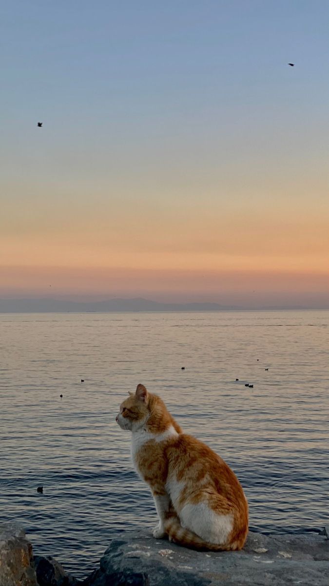 Gambar tersebut membawa kesan kedamaian dan keindahan alam yang luar biasa. Di tengah gambar, ada seekor kucing yang duduk dengan anggun di atas bebatuan di pinggir pantai. Kucing tersebut tampak menikmati momen di alam terbuka yang tenang. Pemandangan laut yang luas dan langit senja yang indah menjadi latar belakang yang memukau. Laut yang tenang dengan ombak lembut mencerminkan ketenangan dan kecantikan alam.