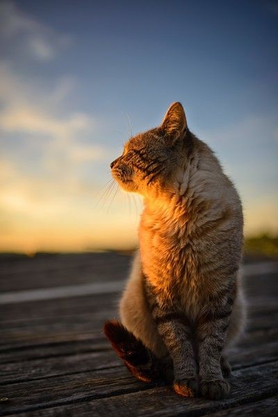 Cahaya senja yang merayap menciptakan efek yang hangat dan penuh cinta. Kehadiran kucing yang melihat ke langit menghadirkan perasaan penasaran dan kekaguman. Ekspresi kucing yang fokus dan tenang menciptakan kesan bahwa ia tengah meresapi keindahan alam di sekitarnya.