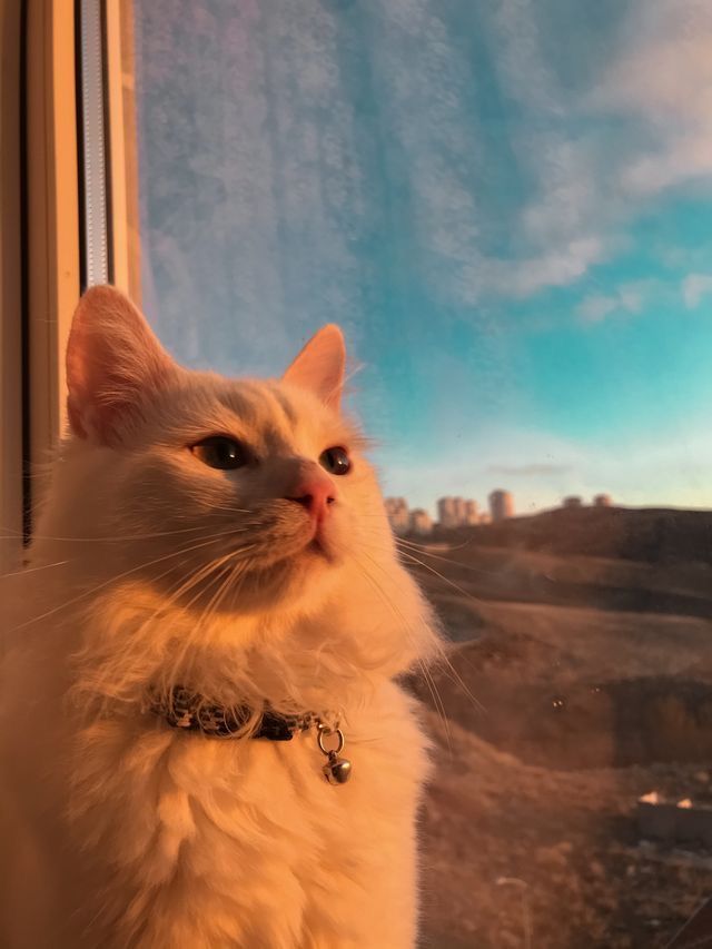 Gambar tersebut menggambarkan momen yang penuh kedamaian dan keindahan. Di tengah gambar, terdapat seekor kucing putih yang sedang duduk dekat jendela. Bulu putihnya tampak berkilau dan bersih, menciptakan kontras yang indah dengan latar belakang. Sinar matahari senja yang lembut menerobos masuk melalui jendela, menyoroti wajah dan tubuh kucing dengan cara yang menakjubkan.