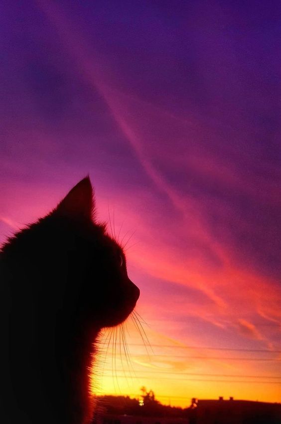 Gambar tersebut menggambarkan momen yang penuh kedamaian dan keindahan. Di tengah gambar, ada seekor kucing yang berpose menyamping, tengah menatap ke langit senja yang menakjubkan. Kucing tersebut tampak begitu tenang dan damai, seolah-olah tengah meresapi keindahan alam di sekitarnya. Latar belakang langit senja menciptakan nuansa yang indah dan romantis.
