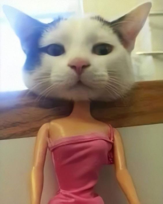 Berikut kalian akan melihat gambar yang sangat lucu dan mengundang gelak tawa, seekor kucing  sedang bersandar diatas kayu meja dengan dibagian lainnya terdapat  mainan barbie, sehingga tampilannya seperti barbie kucing seksi dan lucu, wkwkwk.