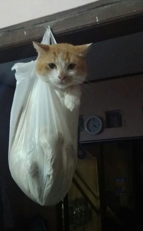 Kucing dengan warna jingga dan putih yang dimasukkan ke dalam kantong plastik dan digantungkan seperti ayunan pasti akan memberikan kesan lucu dan imut. Kucing adalah hewan yang umumnya dianggap menggemaskan, dan tampilan ini akan menambahkan elemen lucu dengan pose dan situasinya yang tidak biasa. Gambar ini mungkin mengundang respons emosional dari penonton.