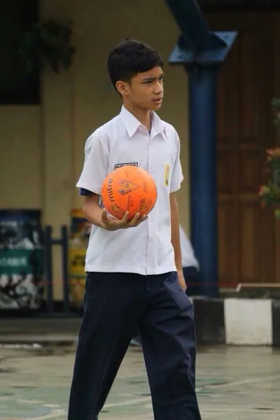 Pada foto berikutnya ini terdapat seorang anak smp yg sedang memegang sebuah bola,tampak jelas pada wajah nya yg melekat dengan hidung mancung,warna kulit yg sawo mateng dengan rambut lurus yg melekat pada wajah tampannya.Dengan ukuran tinggi badan yg terlihat cukup menjadi tinggi menjadikan anak dalam foto ini mungkin sahaja menjadi idaman para teman wanita dikelasnya.