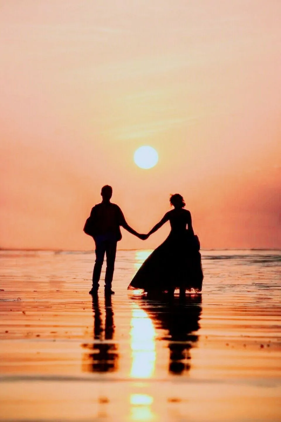 Langit senja bisa menciptakan kesan perubahan dan transisi, yang dapat diartikan sebagai awal dari babak baru dalam hidup bersama. Pemandangan senja sering kali memicu perasaan kontemplatif dan penghargaan atas momen yang berharga. Ini bisa memberikan momen untuk merenungkan perjalanan dan harapan bersama. Pantai adalah tempat yang sering dikaitkan dengan kebebasan dan kegembiraan. Pasangan dapat mengekspresikan keseruan dan kebahagiaan mereka dalam pengaturan yang santai. Langit senja yang penuh warna dan kontras, bersama dengan pemandangan laut yang luas, memberikan kesan dramatis yang memikat.