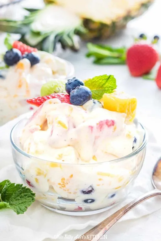 Salad buah kaya akan serat makanan, yang dapat mendukung fungsi pencernaan yang sehat. Yang mana serat ini dapat membantu melancarkan pergerakan usus, mencegah sembelit, dan memelihara kesehatan usus secara keseluruhan.