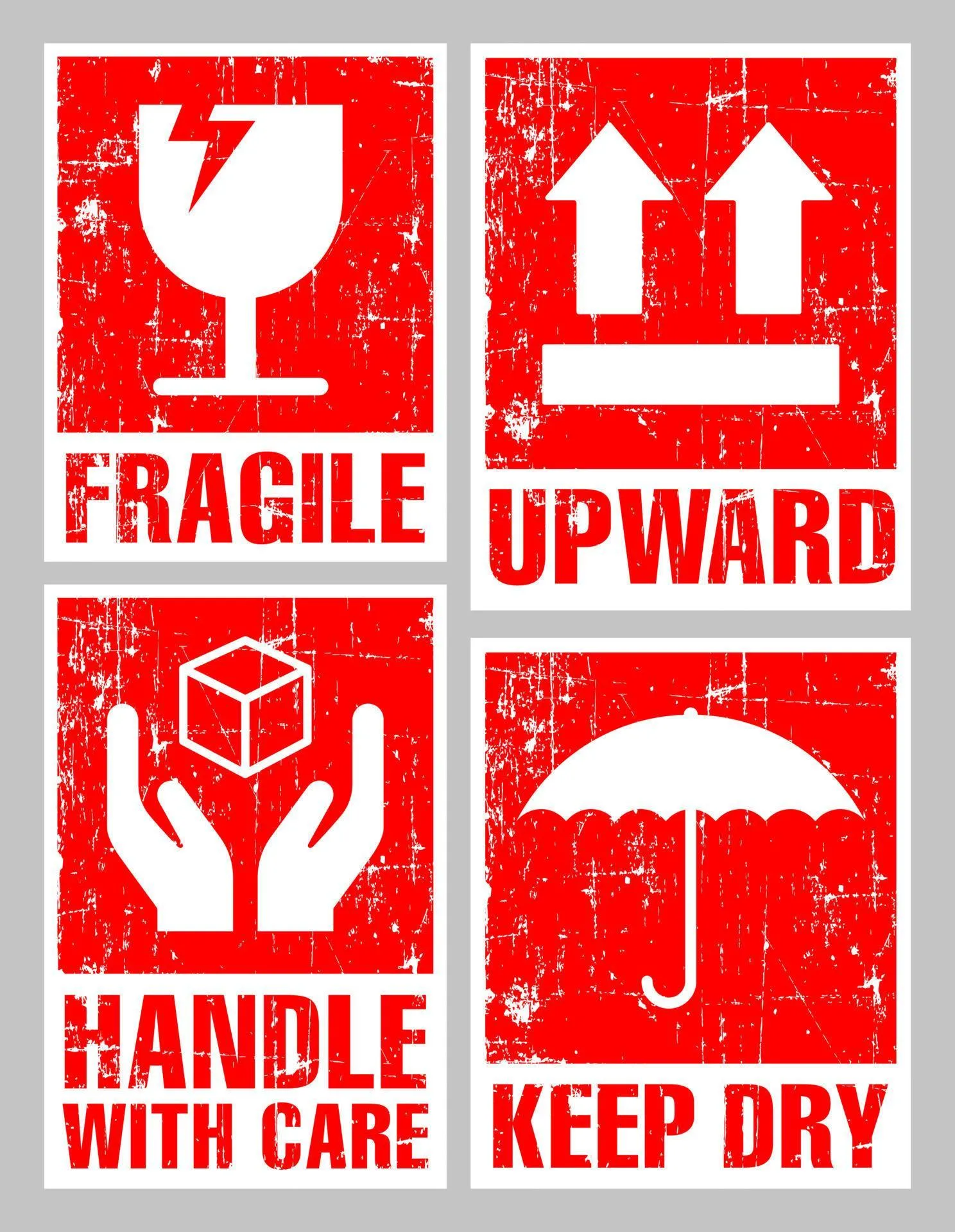 Berikut pada gambar diatas terdapat logo fragile lengkap dengan ragam objek simbol gambar lainnya seperti, KEEP DRY, DON’T TRAMPLE, dan UPWARD. Pada umumnya fragile banyak ditemukan pada paket yg masuk ke dalam pengiriman logistik, terutama untuk paket yg memerlukan packing. Nantinya bakal tampak beberapa simbol berisi informasi terkait tersebut