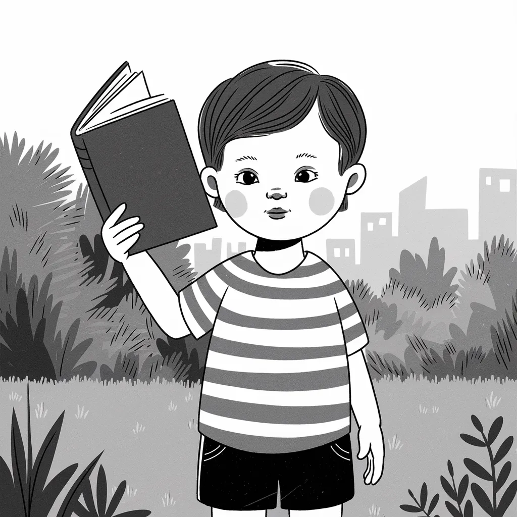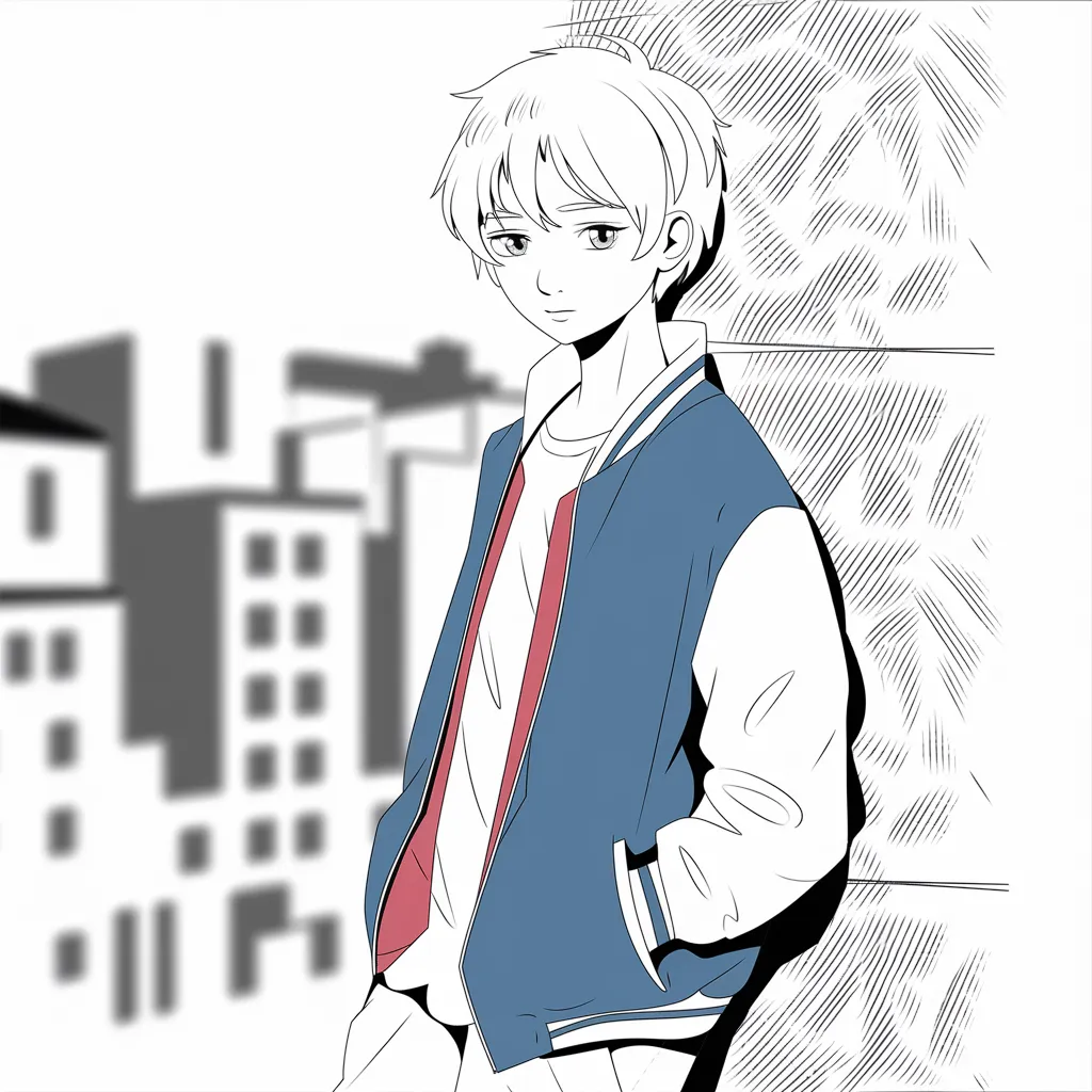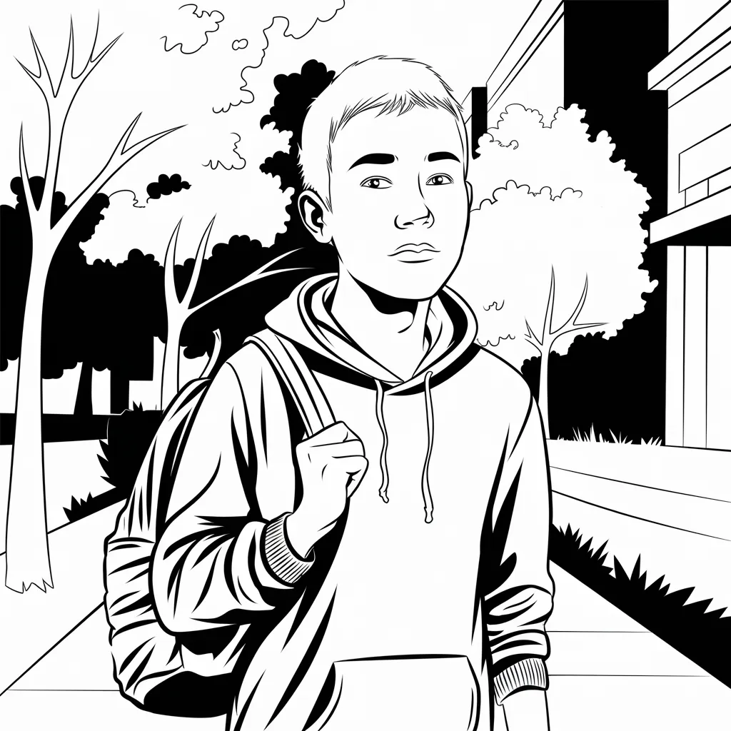 Ilustrasi remaja laki-laki dengan ransel di satu bahu, berjalan perlahan di trotoar, ekspresi wajah datar tapi karismatik.