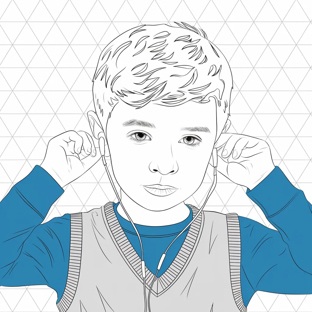 Gambar remaja berkaus hitam, memakai earphone, mata setengah tertutup menikmati musik, kesan tenang dan fokus.