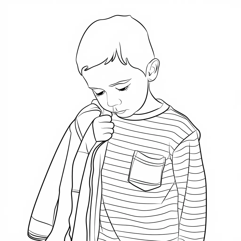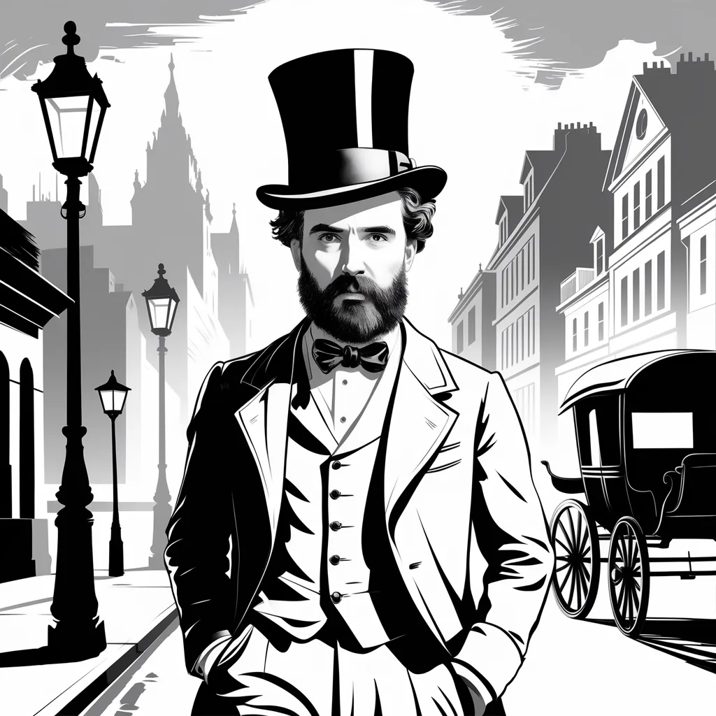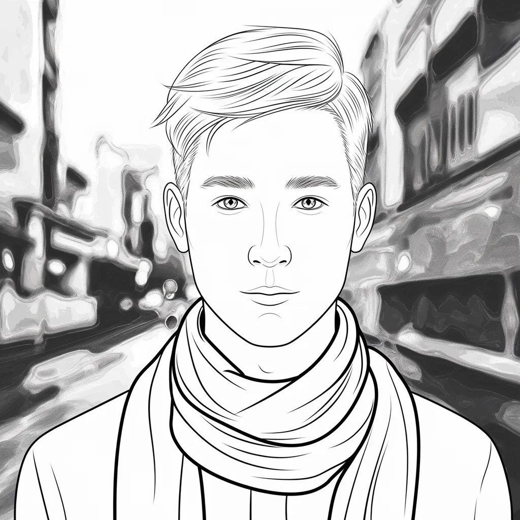 Ilustrasi pria dengan syal tipis tergantung longgar di leher, rambut pendek rapi, ekspresi tenang menatap kamera.