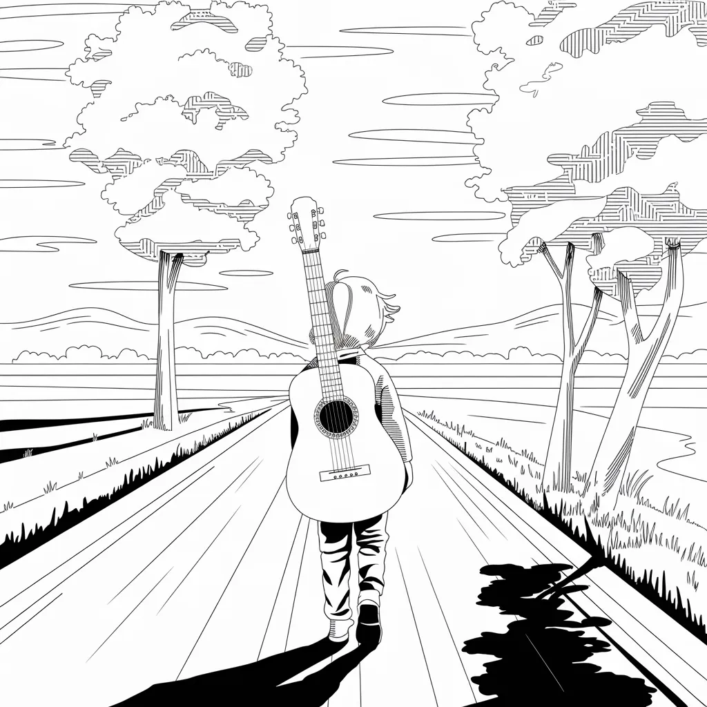 Gambar cowok dengan tas gitar di punggung, jaket tipis, dan senyum tipis, memberi nuansa musisi yang misterius.